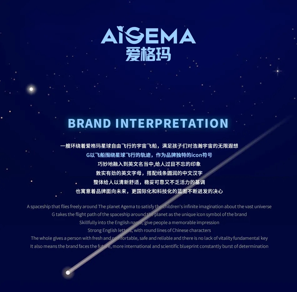 有故事的LOGO,飛船+星軌,小小星夢(mèng)從此開(kāi)始。愛(ài)格瑪星系宇宙,架構(gòu)起所有關(guān)于愛(ài)的哲學(xué)的童話(huà)意義。簡(jiǎn)潔內(nèi)趣,帶領(lǐng)品牌踏上愛(ài)的新征程。