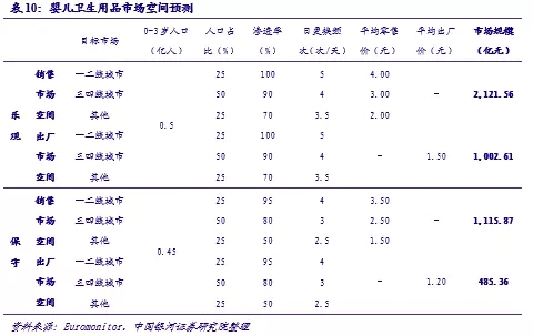 考慮到滲透率、日均使用量以及產(chǎn)品價格帶多種因素的差異,我們同樣按照不同地區(qū)劃分對嬰兒衛(wèi)生用品市場規(guī)模進(jìn)行了預(yù)測。其中因?yàn)?-3歲區(qū)間內(nèi)不同年齡段嬰兒的日均更換頻次不同,預(yù)測中進(jìn)行了取均數(shù)處理,通常新生兒每日應(yīng)該更換6-8次,隨著年齡的增長時間間隔可以逐步拉長。綜上,我們樂觀預(yù)期我國嬰兒衛(wèi)生用品的終端市場規(guī)模約2100億元,保守也可達(dá)到1100億元,較20年市場規(guī)模有60%-200%的提升空間;出廠價按照樂觀1.50元/片、保守1.20元/片的行情預(yù)測,出廠市場規(guī)模也可達(dá)到490-1000億元。