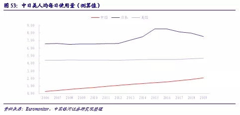 3.人均使用量的提升。伴隨著衛(wèi)生意識的提高,消費(fèi)升級趨勢以及嬰兒衛(wèi)生用品新產(chǎn)品的更新?lián)Q代,家長們會更加注重紙尿褲安全性與舒適感,不斷提高使用更換頻次。根據(jù)測算,日本市場出現(xiàn)波動前每個適齡嬰幼兒(0-3歲)的每日使用量約為6.5片,美國市場的長期均值水平為4.5片/日;對比之下,盡管出現(xiàn)提升趨勢,我國當(dāng)前的人均使用量為2片/日,較發(fā)達(dá)成熟市場存在較大差距,未來有望進(jìn)一步提升至4-6片/日的區(qū)間內(nèi)。