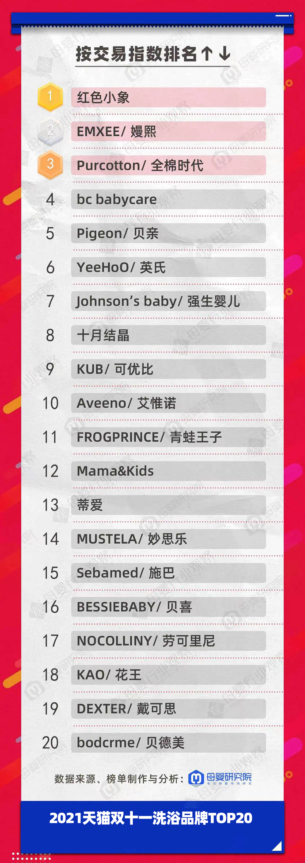 紅色小象、EMXEE嫚熙和Purcotton全棉時(shí)代優(yōu)異地拿下了本次雙11寶寶洗浴品牌的前三。而2020年雙11時(shí),位居前三的是紅色小象、Purcotton全棉時(shí)代和蒂愛(ài)。