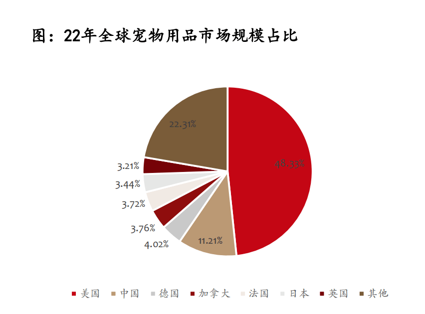 從國家層面來看,目前美國寵物用品市場規(guī)模排名第一,2022年美國寵物用品市場規(guī)模高達230.04億美元,占全球市場份額的48.33%。中國寵物用品市場規(guī)模僅次于美國,2022年市場規(guī)模為53.45億美元,占全球市場份額的11.21%;英國、德國、日本、法國、加拿大也是重要的寵物用品消費市場,根據(jù)歐睿國際的數(shù)據(jù),22年德、加、法、日、英的寵物用品的市場份額分別為4.02%、3.76%、3.72%、3.44%、3.21%。