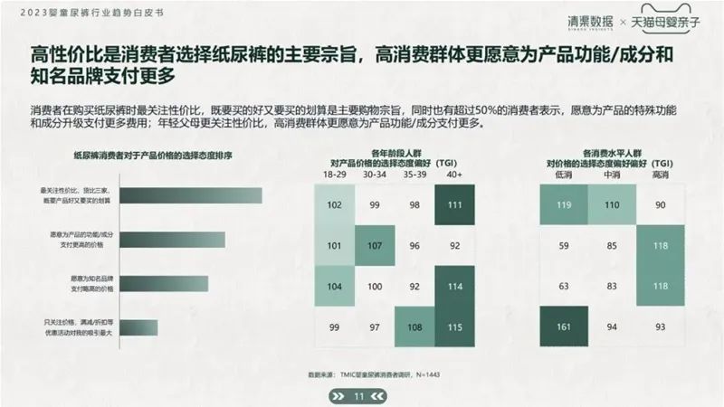 根據(jù)白皮書數(shù)據(jù)顯示,消費(fèi)者在購買紙尿褲時最關(guān)注性價比,“又好又劃算”是主要購物宗旨,同時也有超過50%的消費(fèi)者表示,愿意為產(chǎn)品的特殊功能和成分升級支付更多費(fèi)用:年輕父母更關(guān)注性價比,高消費(fèi)群體更愿意為產(chǎn)品功能/成分支付更多。