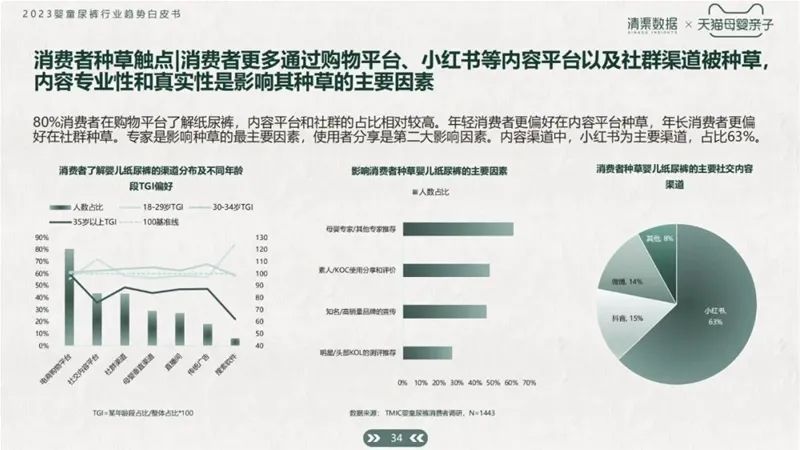 根據(jù)白皮書數(shù)據(jù)統(tǒng)計,80%消費(fèi)者在購物平臺了解紙尿褲,內(nèi)容平臺和社群的占比相對較高。年輕消費(fèi)者更偏好在內(nèi)容平臺種草,年長消費(fèi)者更偏好在社群種草。專家是影響種草的最主要因素,使用者分享是第二大影響因素。內(nèi)容渠道中,小紅書為主要渠道,占比63%。