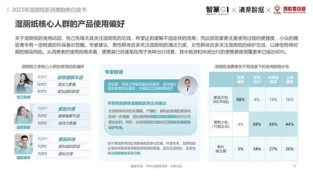 淘系濕廁紙品類近三年的消費(fèi)金額持續(xù)增長(zhǎng),增幅遠(yuǎn)超衛(wèi)生用紙整體市場(chǎng),其中,天貓官旗的消費(fèi)責(zé)獻(xiàn)占主陣地,MAT2023占淘系年度消費(fèi)的六成以上,市場(chǎng)規(guī)模的擴(kuò)張主要來(lái)自消費(fèi)人數(shù)的增長(zhǎng),有越來(lái)越多的新客涌入,共同推動(dòng)溫廁紙的全民風(fēng)潮,同時(shí),消費(fèi)者的使用習(xí)慣養(yǎng)成,復(fù)購(gòu)意愿顯現(xiàn),消費(fèi)頻次也達(dá)到衛(wèi)生用紙整體的增速。